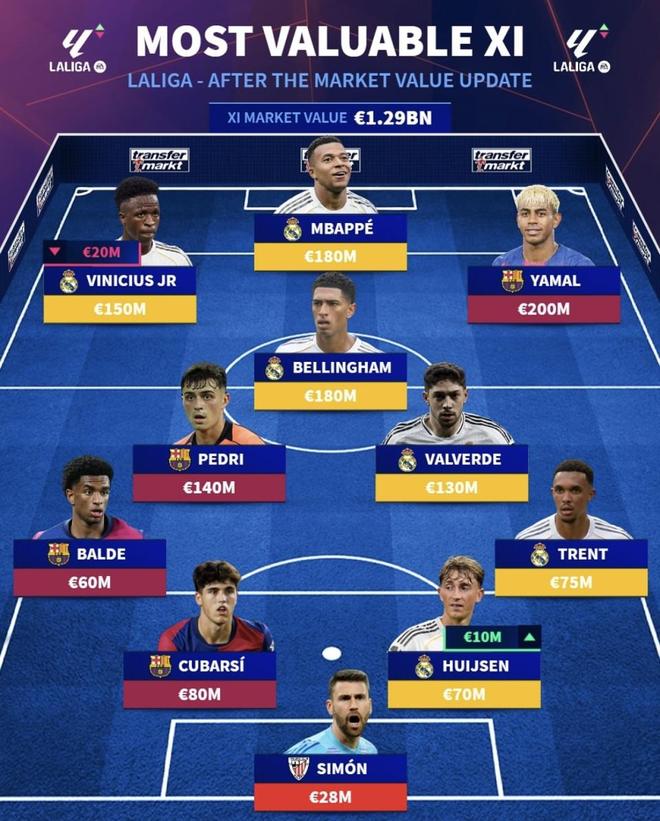 近日,德国转会市场更新西甲球员身价并发布“最有价值11人”:全队总身价达12.9亿欧元。锋线由亚马尔—姆巴佩—维尼修斯领衔,中场有贝林厄姆坐镇;后场库巴尔西与胡伊森、阿诺德等入选,维尼修斯则小幅下调2000万欧元。接下来我们将围绕“名不副实”与“物有所值”两条主线,结合即战力、健康稳定性、样本量与位置稀缺度进行评估。